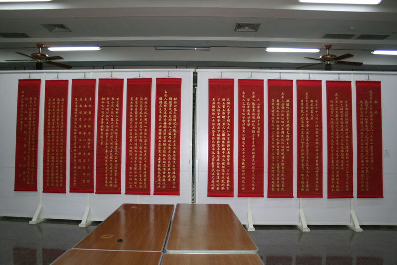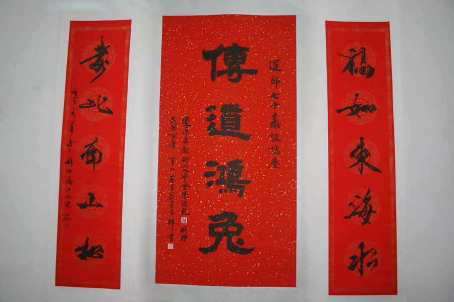 大陸藝術家有申冠武、呂滿如、鄭品一、趙會銘、王成喜、余海龍、李俊文、康山岩、梁詩印、孫英源、傅曉文、王春雷、頓長彬、武海鷹畫鶴壽、孫承志、徐中興、馮學智、楊傑、張東海、戴連弟、常福清、郭學忠畫富貴神仙圖、吳龍鳳、蔣海田、孫學東、王青山、南存(王)美、郝雙良畫紫氣東來、朱玉生、周亞男、潘庭云、王敬、張濟海、郭文卿、王合忠、郭佩民、李禾、吳建祿、蔡宜然、李佩強、古泥、趙守平、韓炳文、王輝傑、王湘雲、王文波、牛建新、孟祥元、杜俊鋒、裴會、左國浩、崔元澤、阮聖杰等 除了上述兩岸現代書畫家之外,此次展覽也呈現珍貴的先賢作品,如浙江天臺人王世芳(1659一1708)時年115歲的作品財子壽、日人狩野探幽(1602–1674 江?時代幕府御用畫師)福神作品、費丹旭(1801一1850) 笠屐圖、清朝人曹蘭用四季花卉所畫之萬壽無疆作品、楊草仙(1838一1944) 日治時期被日日新報尊稱為中華民族三千年來草聖,時年91壽字作品、被形容為台灣三異人朱少敬的作品子壽延年、一代墨神陳雲程百歲作品、楊飛的無量壽佛,最值得一提台南酉山詩社社長?廷楨用珍貴?金泊研粉所書的12屏壽聯(本聯和謝琯樵所書石芝圃八十壽屏被稱為府城二大屏聯),全篇1084字用楷書所書寫,展現書法精神及功力直追臺灣文獻先賢郭蘭石。