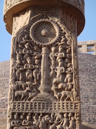 桑吉佛塔牌樓石柱上的石雕,大量運用象徵主義的表現手法,佛陀形象完全隱沒,只以佛塵、蓮花、足印、傘蓋、法輪、台座、菩提樹、三寶標誌等寓意佛陀及其行為。當然,象徵還是得用寫實或具象來表現,導致觀賞者虛、實或意識流動,同理心躍然而出。