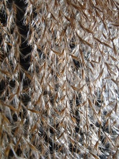 花:圓錐花序,花軸約為花序之2/3長;小穗成對,長約0.3cm;外穎2細齒裂,3出脈;內穎纖毛緣,透明;上位外稃脈單出,延伸成細曲的短芒;內稃極小,透明。