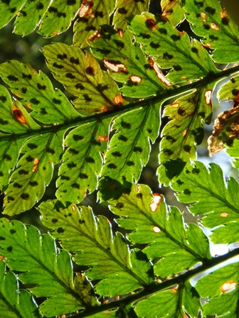 葉:叢生;柄長約30-35cm,基部密被黑褐色披針形鱗片;葉2回羽狀複葉,五角形,長約30-40cm,寬與長略相等或較短;基部羽片之下側小羽片特長;背面葉軸上具多數之小囊狀鱗片。